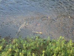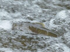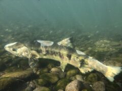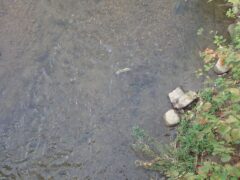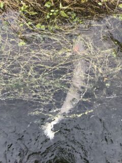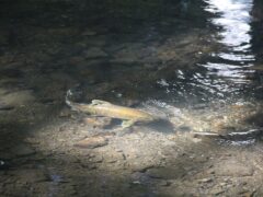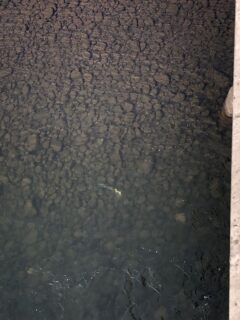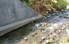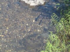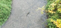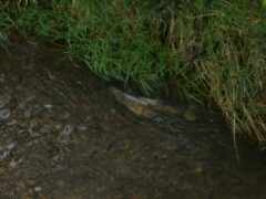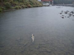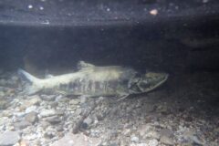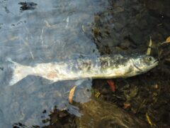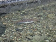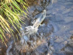 サクラマス 9/16 三樽別川 三樽別1号橋と2号橋の間の魚道内 あたりに産卵適地はなさそうですが、念のため魚道を覗き込んでみたところサクラマスを見つけました。お腹が卵でふっくらしていますね。