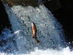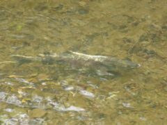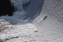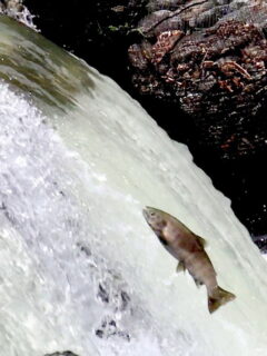 サクラマス 9/24 精進川の滝から100メートル下流 少し濁っていましたが、10尾ほどのサクラマスが確認できました。産卵行動中のものや、滝をジャンプするサクラマスもいて、たくさんの方が観察に来られていました。