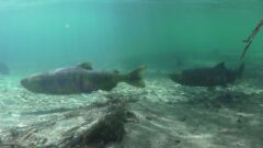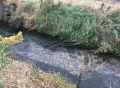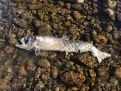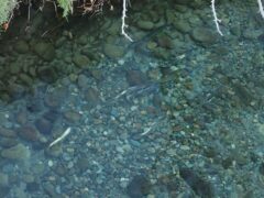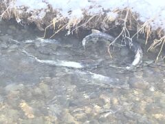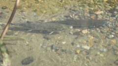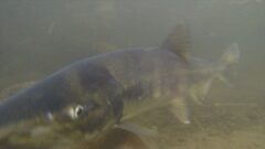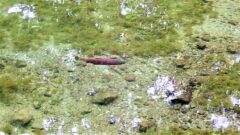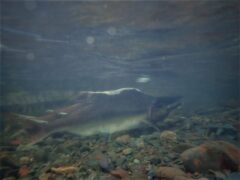 サケ 12/15 富山県庄川支流地久子川 高岡市石瀬にあるヤナ施設より下流部に合流点のある地久子川では、多くの産卵床と斃死した産卵後のサケが確認されます。このサケは、産卵が終わり、産卵床を守ってるのか、長い時間、じっとその場に留まっていました。