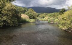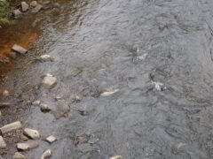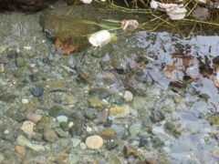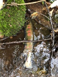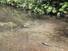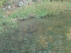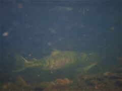 サクラマス 8/25 斜里川水系札弦川支流オニセップ沢川 お盆明けのオニセップ沢川。上流はもう産卵が終わっていましたが、下流ではまだサクラマスが見られました。2匹のオスが30分以上も戦っていました。