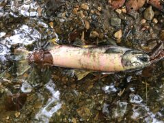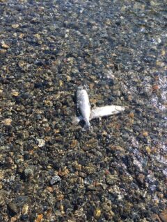 カラフトマス 9/7 鬼志別川上流新小石橋周辺 鬼志別川上流小石地区周辺 川原にカラフトマスの死骸が数匹、何かに食べられた痕跡が有りました、付近には熊・キツネ・鳥類の足跡が沢山ありました。