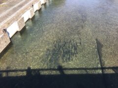 サクラマス 9/28 精進川、氷池から50m程上流の片面コンクリートの水道(河川)前日からサクラマスの数の変動は少なく、水深が深い場所で休んでいる固体が目立ちました。隙を見ながらピッタリと張り付いている小魚(山女?)が健気です。