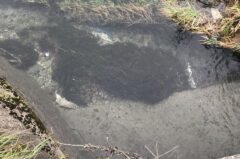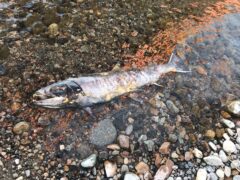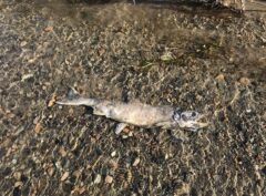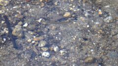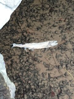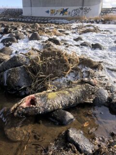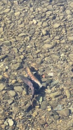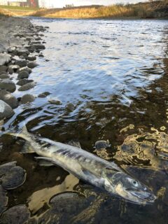 サケ 11/22 富山県庄川、射水市西広上地先 本日、射水市広上での天気は、曇り、気温も水温も低くなってきました。射水市広上地先の河川水温は、13.2℃となっています。サケ稚魚放流地点付近にて、産卵後の斃死親魚が4尾(♀1尾、♂3尾)、近くに産卵床も確認されました。