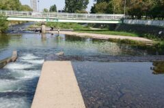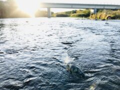 サケ 10/6 石狩川上流忠別川ツインハープ橋下流 旭川市内でサケの観察がしやすいポイントです。過去に北海道区水産研究所で、この場所に大規模な稚魚放流が行われたことから、産卵時期には産卵行動が観察できます。