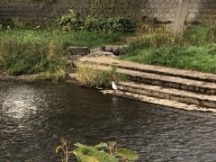 サケ 10/11 JR鉄橋上流の産卵環境改善のための水路内 水路にサケ来ましたね オス2匹、メス1匹を発見。離れてじっと見守っていたら、メスが産卵床を掘り始め、オスも盛んに求愛していました