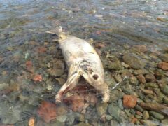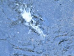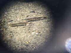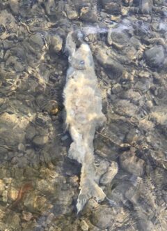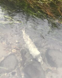 サケ 10/8 初山別村の茂初山別川 開運橋の上流約50m 産卵行動を行うサケのペアと産卵床が見られました。草陰に隠れたため尻尾のみ見えています。産卵床の横にキタキツネの死骸が見えますが、いったい何があったのでしょうか!?