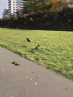 カラスとホッチャレ 11/6 豊平川の豊平橋上流 先ほどの河川敷の写真の別ショットです。サケの写真を撮りたく近づいたところ、しれ~とカラスがよけてくれました。朝食中に失礼いたしました。