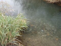 サケ 10/30 庄川、南郷大橋上流域右岸、河口より10.6km 庄川は、増水中だが、湧水、伏流水の豊富な分流に、サケ親魚確認。産卵床と思われる掘り返した後も近くにあり、自然産卵が行われている模様