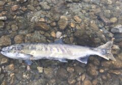 サケ 10/27 富山県庄川南郷大橋上流域右岸河口より10.6km地点 河口より5.4km地点にあるヤナを乗り越えた個体。2019年度、初確認の遡上サケ親魚 尾叉長 72.5cm、体重3.08kg、♂ 庄川のサケは11月中旬が遡上のピークであり、早期に遡上した個体と思われる。台風や雨による増水が続いており、無事産卵できたことを願うばかりです。