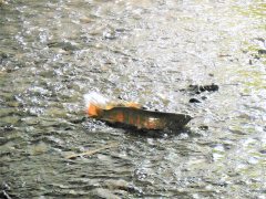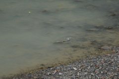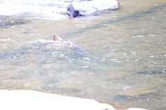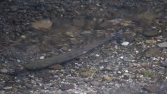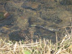 サケ 11/3 兵庫県新温泉町美方警察署近くの岸田川 昨年のポイントで泳いでいるのを発見しました。この日捕獲用の檻に26匹入ったと岸田川漁協組合長よりお聞きしました。久斗川という隣の川にも上ってきているらしく次回のお楽しみです。寒い日でついたのが午後で雨と強風の悪条件でした。条件が良ければもっと見えたと思います