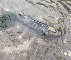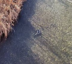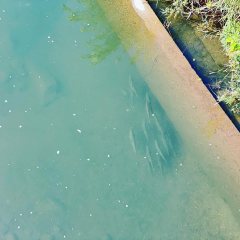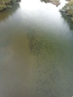 サケ 10/24 丸子川の橋の上からか 秋田出張の際に、丸子川の橋の上から見つけました。河口から雄物川を経て、約70km近くを遡上、頑張りましたね。残念ながら200mほど上流には「うらい」がありました…