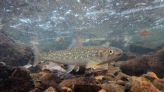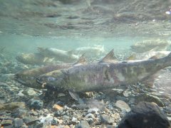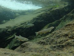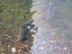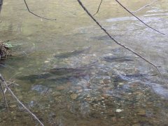 産卵床付近には数匹のサクラマスとヤマメが群れていました。