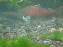 腹を突きながらメスが一生懸命産卵床を掘っています。