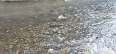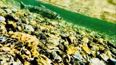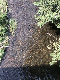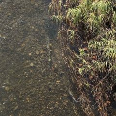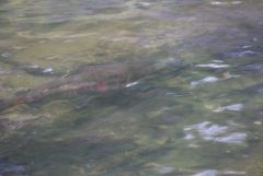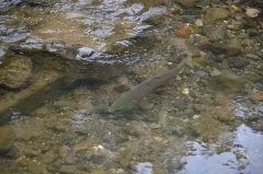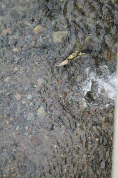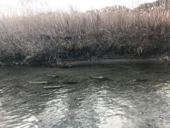 ふもとばしの真下にてサクラマス1匹を発見しました。よく見ると右岸には産卵床が周りの藻とは対照的に円形に砂利が詰まれていた産卵床もあり、その子はずっとその産卵床にいたのです。