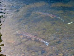 サケ 11/25 倉吉市天神川今津堰堤の上(倉吉駅近くの河北中学校の裏) 撮影時天神川漁協のかた二人がが捕獲中の鮭を手に持ってぶら下げて見せてくれました。今日は水量が少なく見にくいが昨日は数匹みられたとのこと。