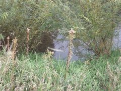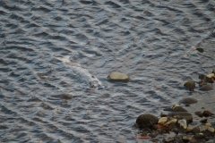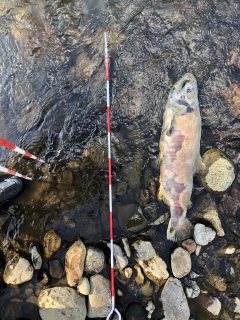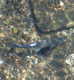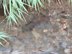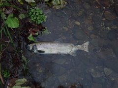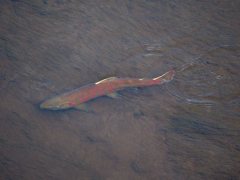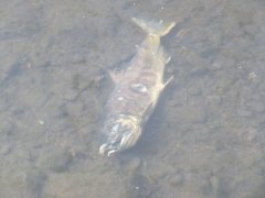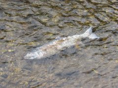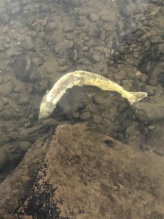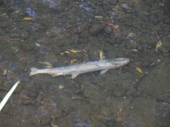 サケ 11/5 秋田県_玉川(雄物川合流点近くの新玉川橋の下流の右岸水際) 秋田県・雄物川の支川、玉川の水際でホッチャレを見つけました。河口から約70km上流のウライの下流でした。ウライは超えられなかったようです。ちょうど近くにいた漁協のおじさんが、「ウライの下で結構、サケが自然産卵しているんだよ」と教えてもらいました。このサケも産卵できた?のかもしれません。