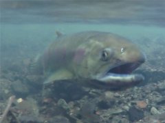 サクラマス 10/7 豊平川の水穂大橋下流約50m そろそろサケの遡上が見れないかと東橋から瑞穂大橋を散策していたところ、1匹だけ堰の下の淀みに小ぶりのサケ(SWSPでサクラマスと同定)を見つけました。写真は動画からの切り取りです。