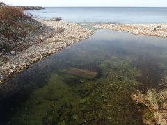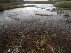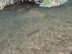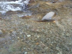 サクラマス 9/27 占冠村の鵡川にかかる営農橋上流付近 川岸に産卵床ができていて、写真の中央付近にサクラマスのメスが写っています(丸く白く見える石の上あたり、わかるでしょうか?)。