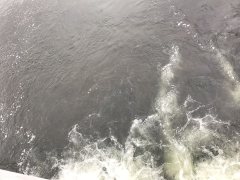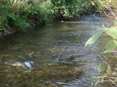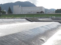 サケ 9/13 白老町の敷生川に設置された製紙工場の取水堰下流(敷生橋の上流約200m地点) 雨で増水した流れに負けじとサケが泳いでいましたが、流れが速すぎてその場に留まるのがやっとのようでした。