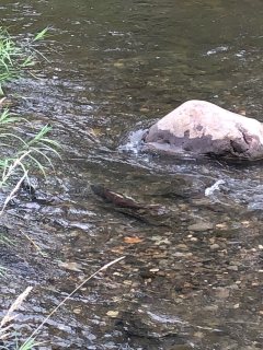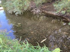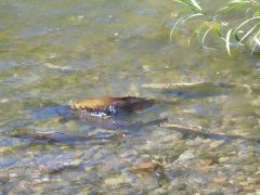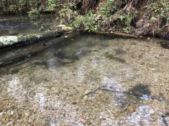 サクラマス 9/24 真駒内川公園橋 サクラマスが橋から見やすい場所で産卵行動をしていました。穴掘りをしているメスの他に、オスのサクラマスとヤマメも付いていて、もうすぐ産卵しそうです。