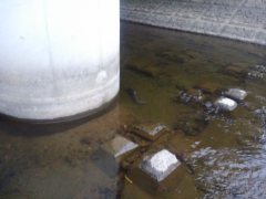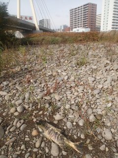 サケ 10/26 豊平川環状北大橋の上から雁来方面を向いた方向 サケさがそ!の地図にここでの目撃の報告が無いのを見て、本当にいないのか?いそうだけどなと思って行ってみたら普通に力尽きた個体が橋の上から見えた。