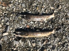 サケ 10/25 豊平川環状北大橋の上 力尽きたサケの姿が2匹橋の上から見えた。また、この橋の上の街灯は、とまりやすいのか、この上に鳶か鷲のような鳥が(大きかったのでカラスでは無い)何羽か止まっており、けっこうこの辺りに魚がいるのかもしれないと思った。