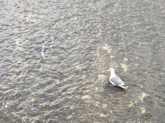 サケ 10/25 豊平川平和大橋の上から西側を向いた方角 ここ数日間、豊平川のサケを見て回っていた。豊平橋から豊水大橋まで見たが全ての橋の上から力尽きた個体が見えた。しかし、生きて泳いでいる個体を見たのはこの個体一匹だけ、橋を降りた小さい岸辺の近くにも来ているのが見えて急いで橋から降りてみたがタイミングを外し、また橋の上に戻り写真を撮影した。動画も撮影した。流れの緩い岸辺でゆっくり休むように泳いでいたのが印象的だった。