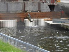 サケ 9/25 小樽運河洋服の青山前 写真の少し下流では、多くのサケが遡上していましたが、魚道も無く、ゴミでサケが通れるほどの水路もなく、ジャンプをひたすら繰り返していました。